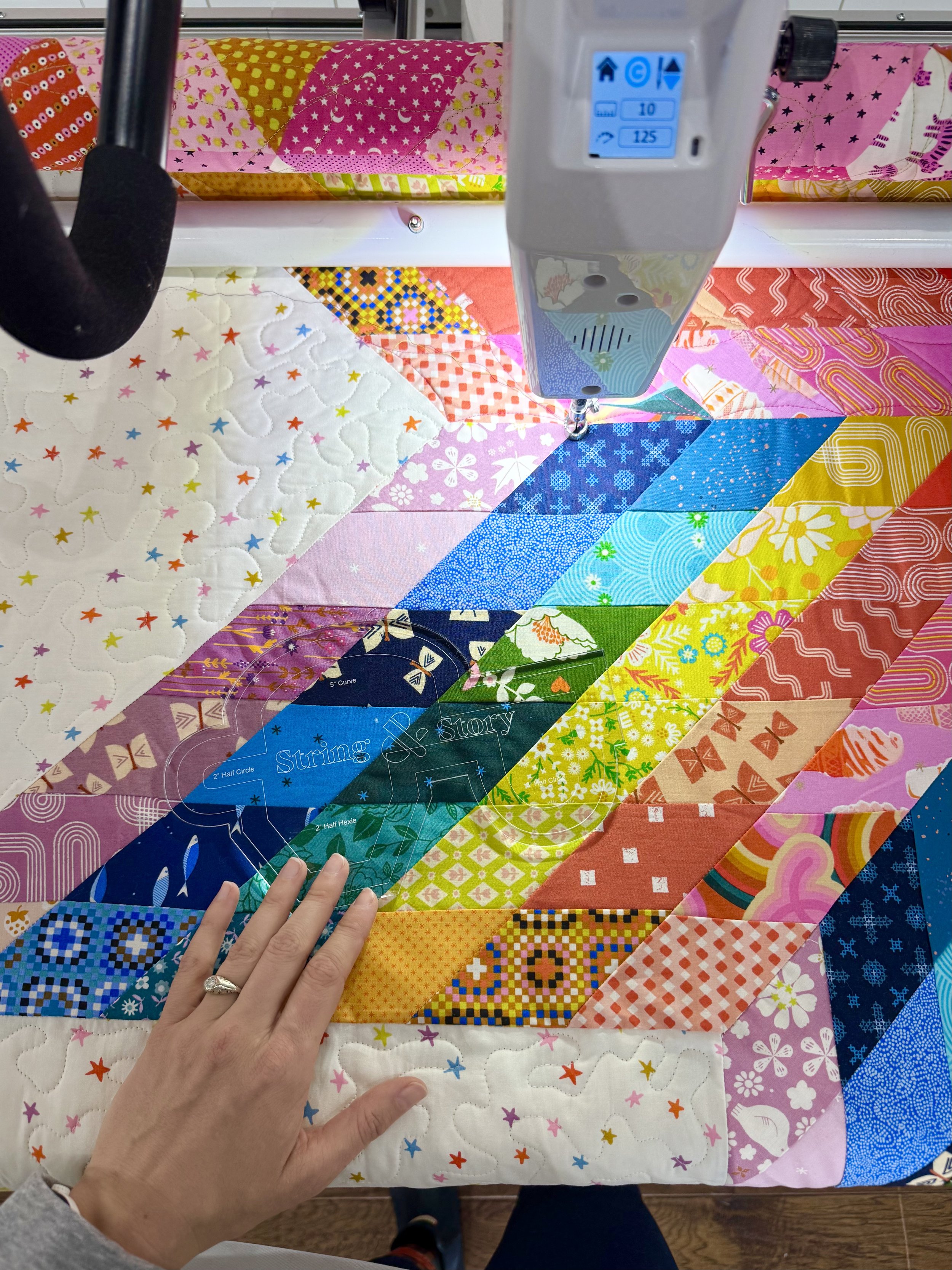 In the star, I recommend choosing a motif that will accent the gorgeous parallelogram shapes of the piecing. Personally, I love continuous curves. They’re simple, straightforward to quilt, and they add a gorgeous harmony of texture to the melody of the piecing. You can free motion the curves if you like, but I prefer to use the Quilting Rockstar Ampersand Ruler (shown above) to guide my curves and keep them more even.