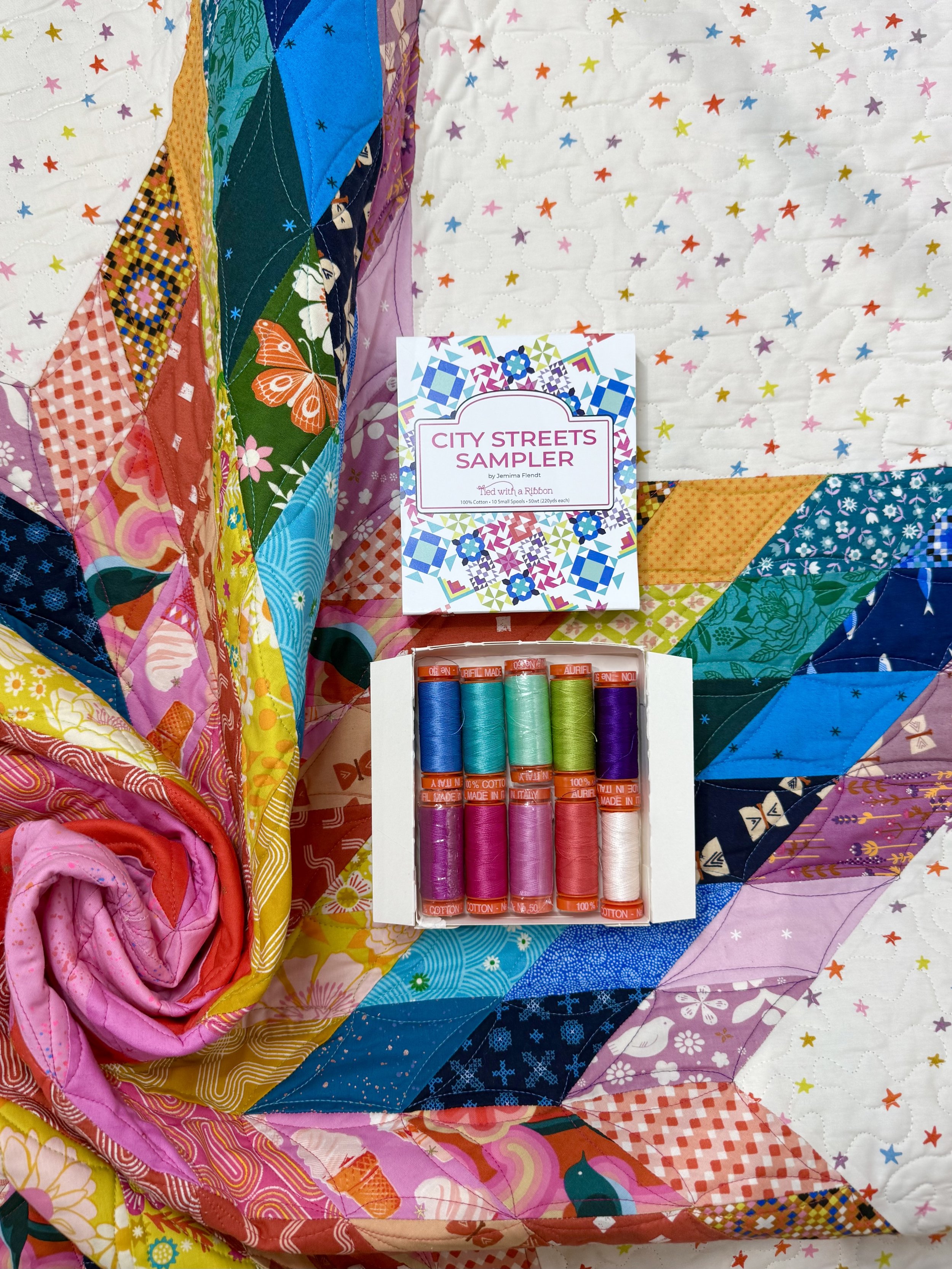 For this scrappy lonestar, I used Tied with a Ribbon’s City Streets Sampler Aurifil Thread collection. It’s my favorite 50 wt thread, and I love the rainbow of colors! I used 7 of the 10, and I really enjoyed matching threads to each of the color stories in my quilt. It’s a subtle detail that adds a little extra depth to my simple continuous curves.