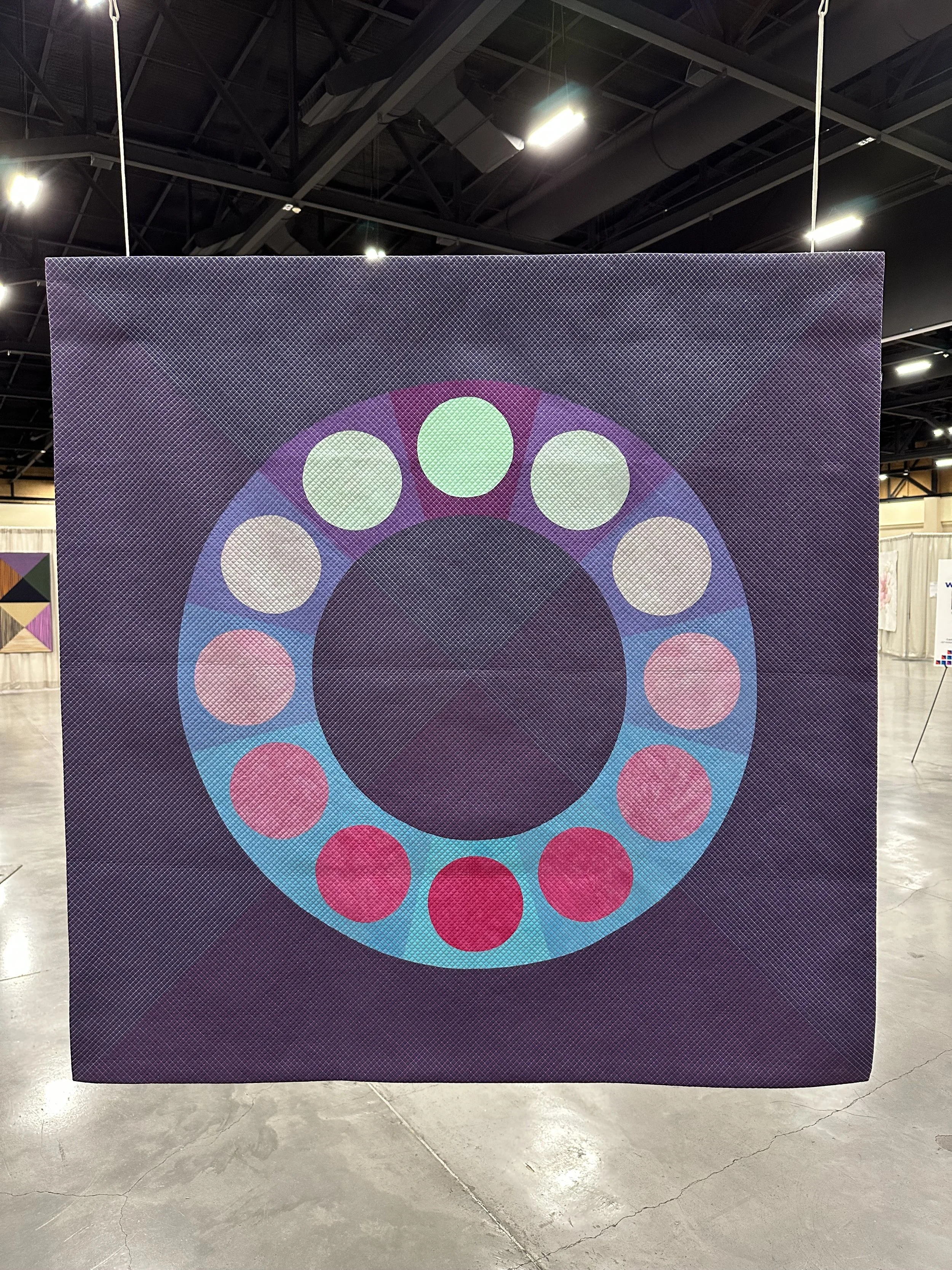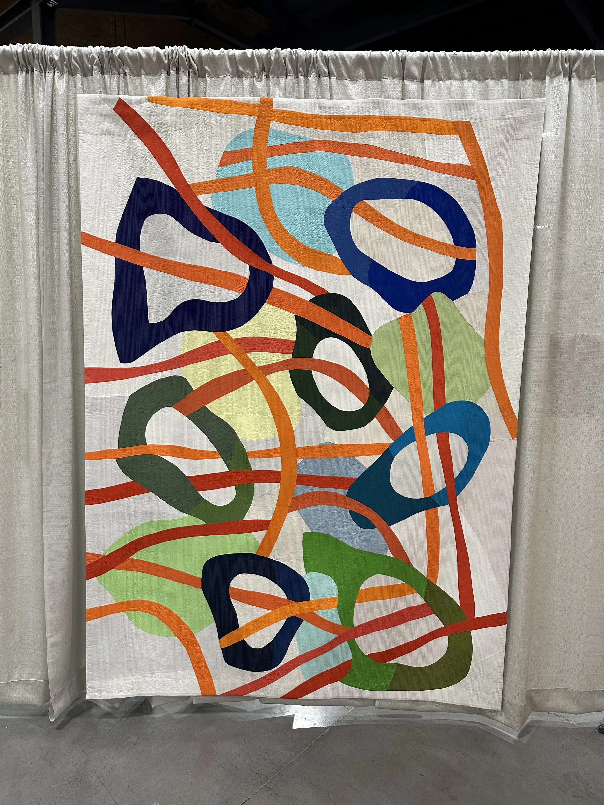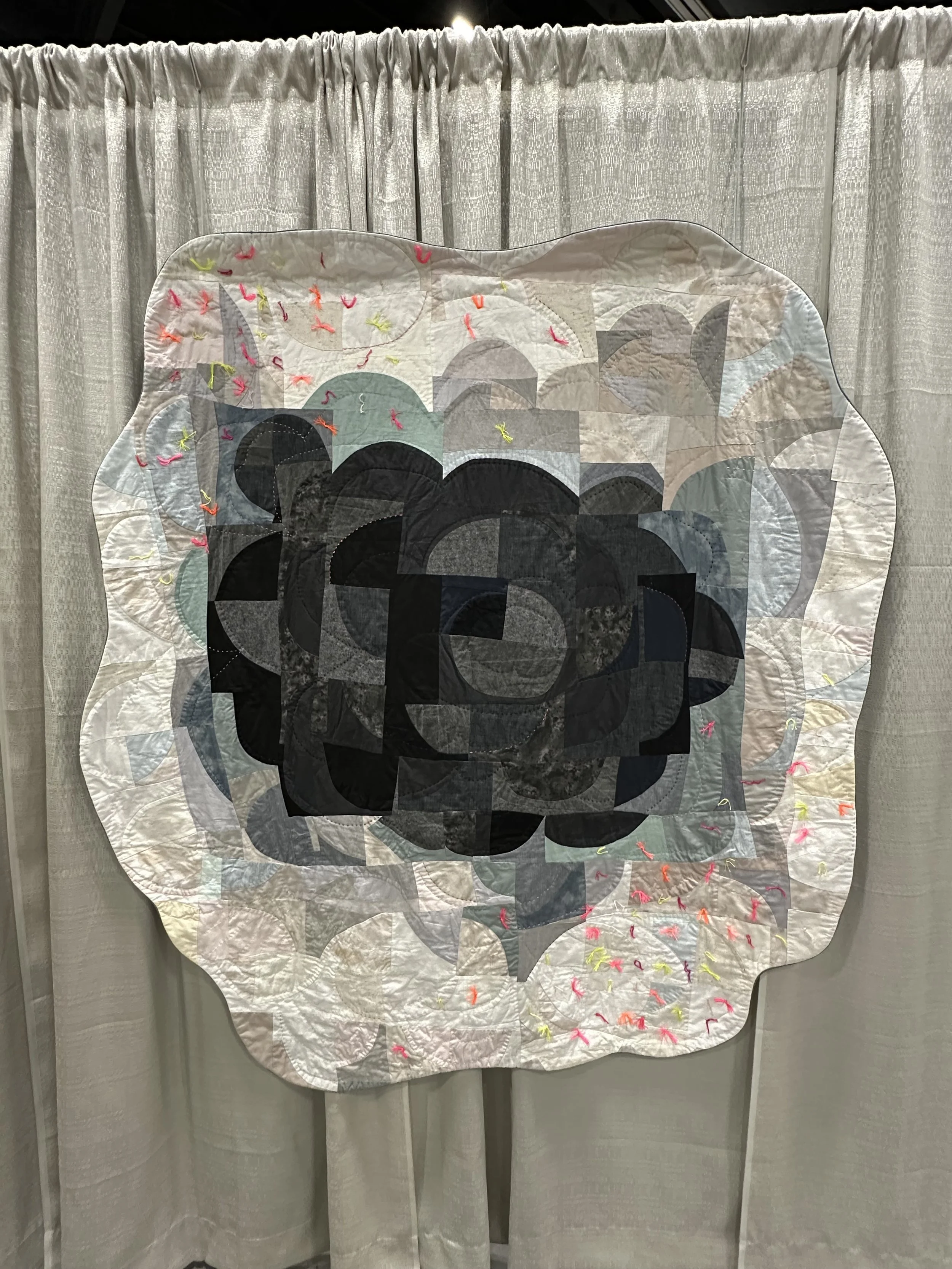 When circles began appearing at QuiltCon a number of years back, there were lots of Drunkard’s Path type blocks. This year’s circles made me think “perfect and playful.” Skill has progressed to where nearly perfect whole circles are being stitched– and then they’re being “broken” again by piecing, quilting, the use of trapunto, and other techniques that add an element of whimsy back to the quilt.