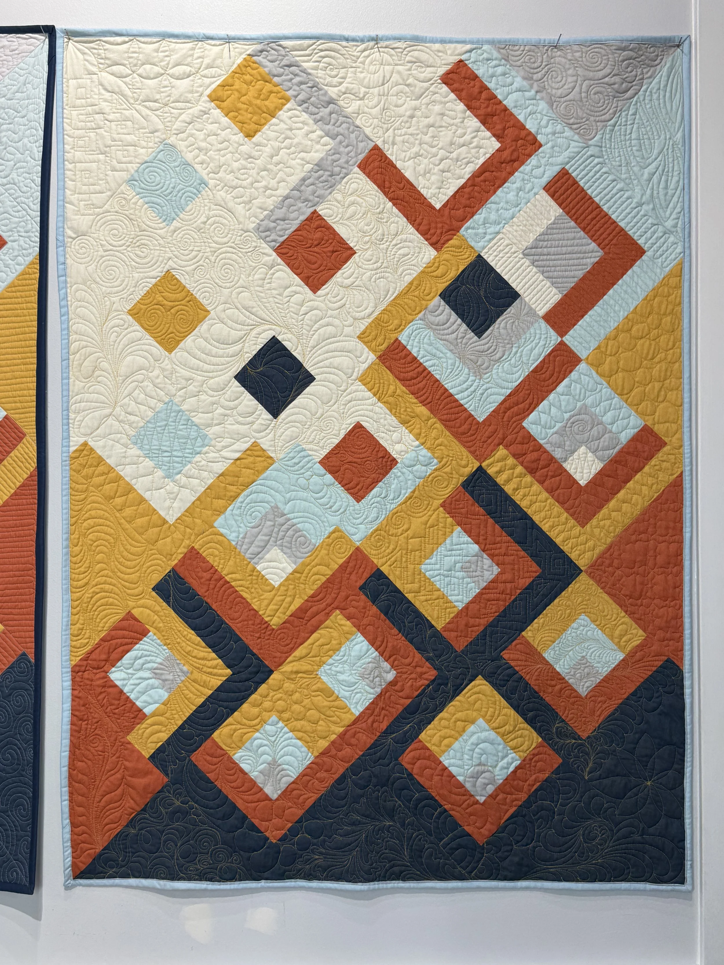 The beauty of simple piecing is that it can be the perfect background for truly complex quilting, especially if you chose to use solids to piece your quilt top. The sparkle of different colors adds texture behind intense quilting.